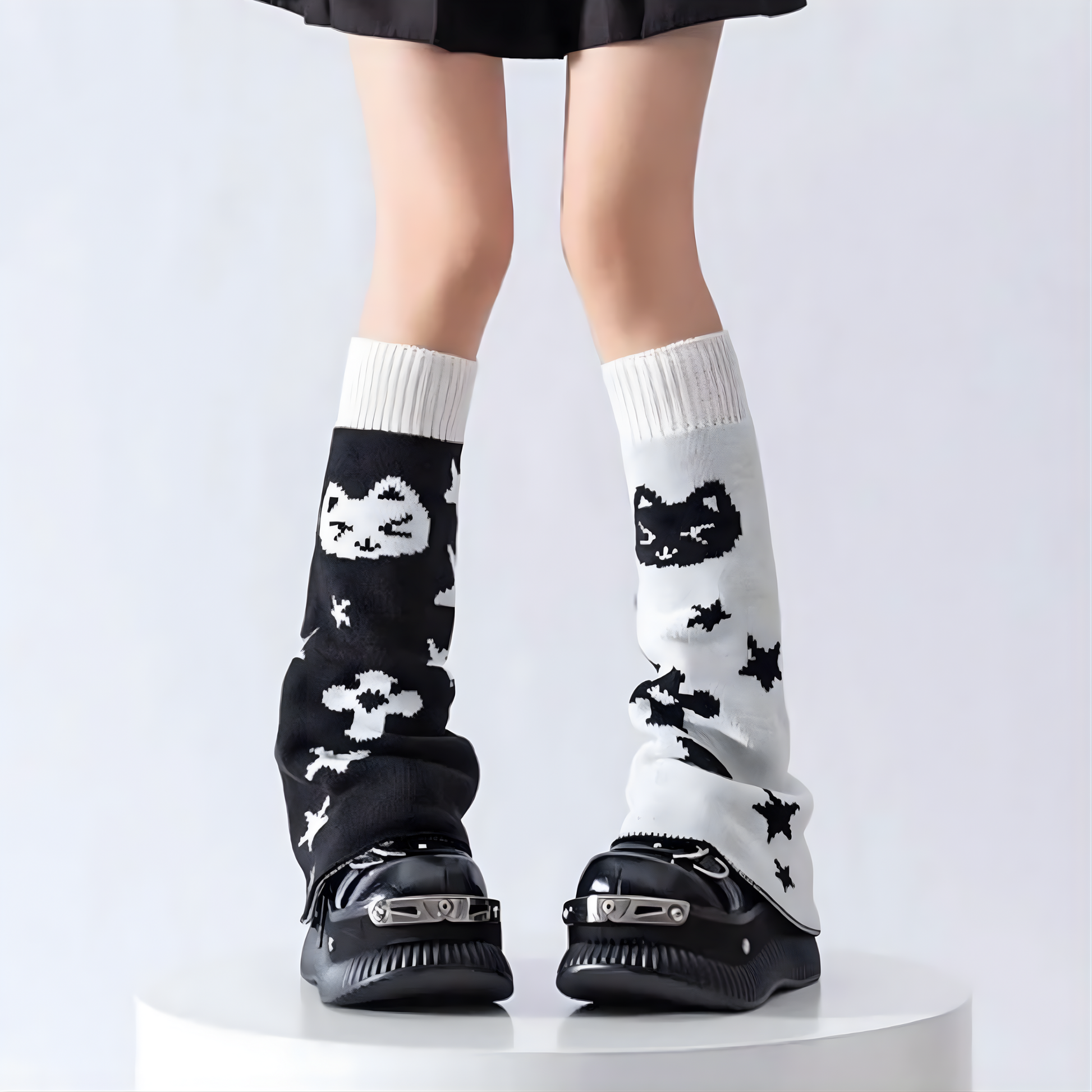 Embrace playful rebellion with these Cat Knit Leg Warmers, a statement accessory that blends cute iconography with dark street style. Featuring bold cat faces, crosses, and star motifs, they add contrast, texture, and attitude to any outfit. Wear them scrunched over chunky platforms or pulled higher for a sharper silhouette, either way, it’s cozy comfort with unmistakable edge.